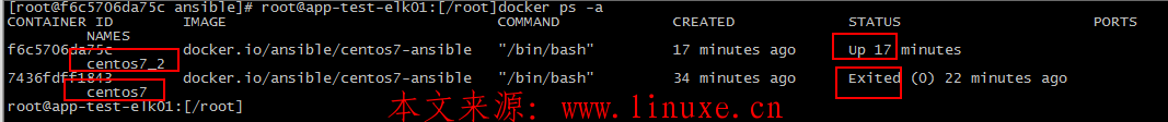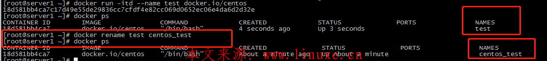 #使用docker ps命令可以看到命令后的名称 docker run -it --name=centos_test --hostname=server1 centos /bin/bash #/bin/bash是让容器保持运行这个进程,也可以是以前台方式启动其他服务,以免容器状态结束