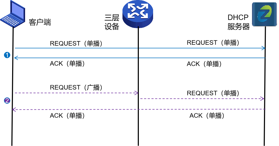 - T2时间续约:如果T1时间续约失败后,客户端认为之前分配地址的DHCP服务器已经故障,为了保证已经获得的IP地址可以正常使用,客户端会在T2时间使用广播的方式发送DHCPREQUEST报文,目的是收到该报文的所有DHCP服务器都可以为客户端续约使用。三层网关设备收到报文后,会使用单播的方式将该报文中继至DHCP服务器。DHCP服务器收到报文后检查本地租约信息,确认这个IP地址没有分配给其他客户端时,会使用单播的方式回复DHCPACK报文,至此客户端完成地址续约,并且地址使用时间从当前开始向后顺延T时间。