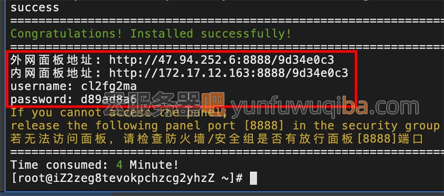 宝塔面板安装完毕后,会提示“Congratulations! Installed successfully!”并返回外网面板登录地址、用户名username和密码password。如下图: