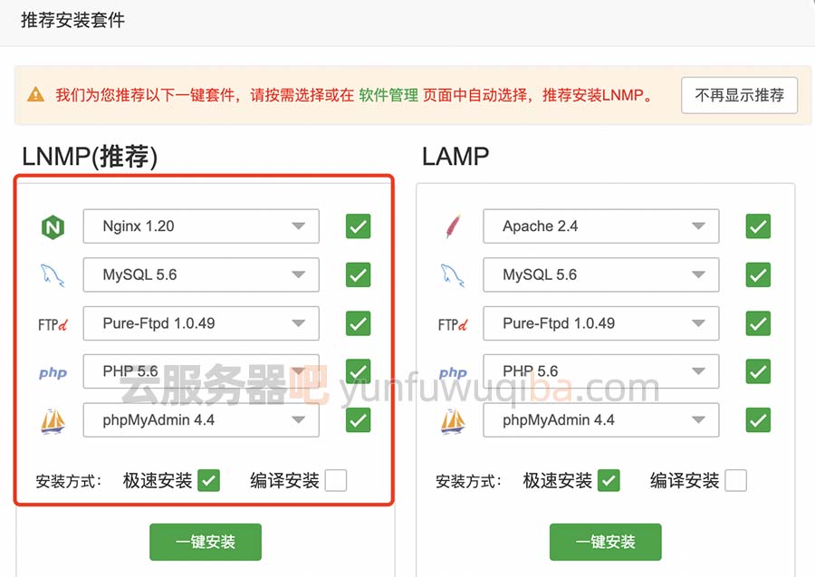 登录宝塔面板后会提示推荐安装套件,选择“LNMP(推荐)”,默认LNMP环境程序版本为:Nginx 1.20、MySQL 5.6、Pure-Ftpd 1.0.49、PHP 5.6、phpMyAdmin 4.4,默认是极速安装,点击“一键安装”,如下图: