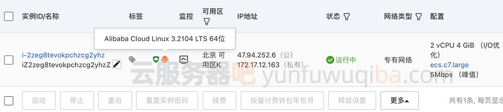 云服务器吧创建了一台阿里云服务器ECS计算型c7实例(ecs.c7.large)2核4G配置,5M公网带宽,操作系统为Alibaba Cloud Linux,如下图: