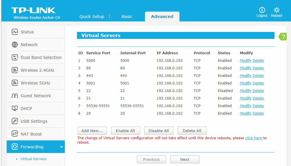 3. 路由器管理界面–>Forwarding–>Virtual Servers,按上图所列端口列表,逐一添加即可。其中,192.168.0.102为NAS的内网IP。由于路由器有可能给内网的终端设备重新分配IP地址,所以有必要在路由器的DHCP设置中,将NAS的内网IP锁定为192.168.0.102。端口转发设置完成图如下。