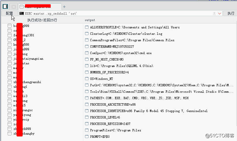 在中国菜刀后门管理工具中,对获取的webshell配置数据库连接信息,然后进行数据库管理,如图7所示,可以执行“EXEC master..xp_cmdshell ‘set’”命令来查看系统当前环境变量等配置情况。