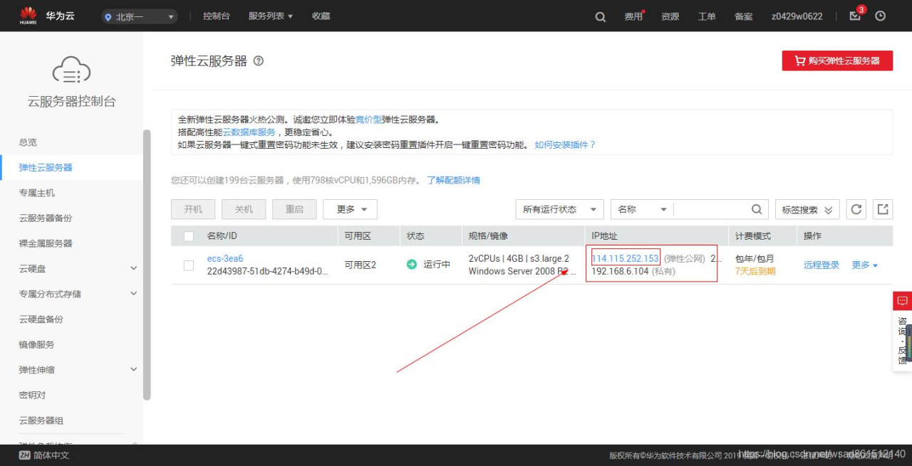 接下来我们使用Windows自带的远程连接工具来连接我们的华为云Windows服务器,这时我们需要先在华为云弹性云服务器页面复制外网IP地址,如下图;