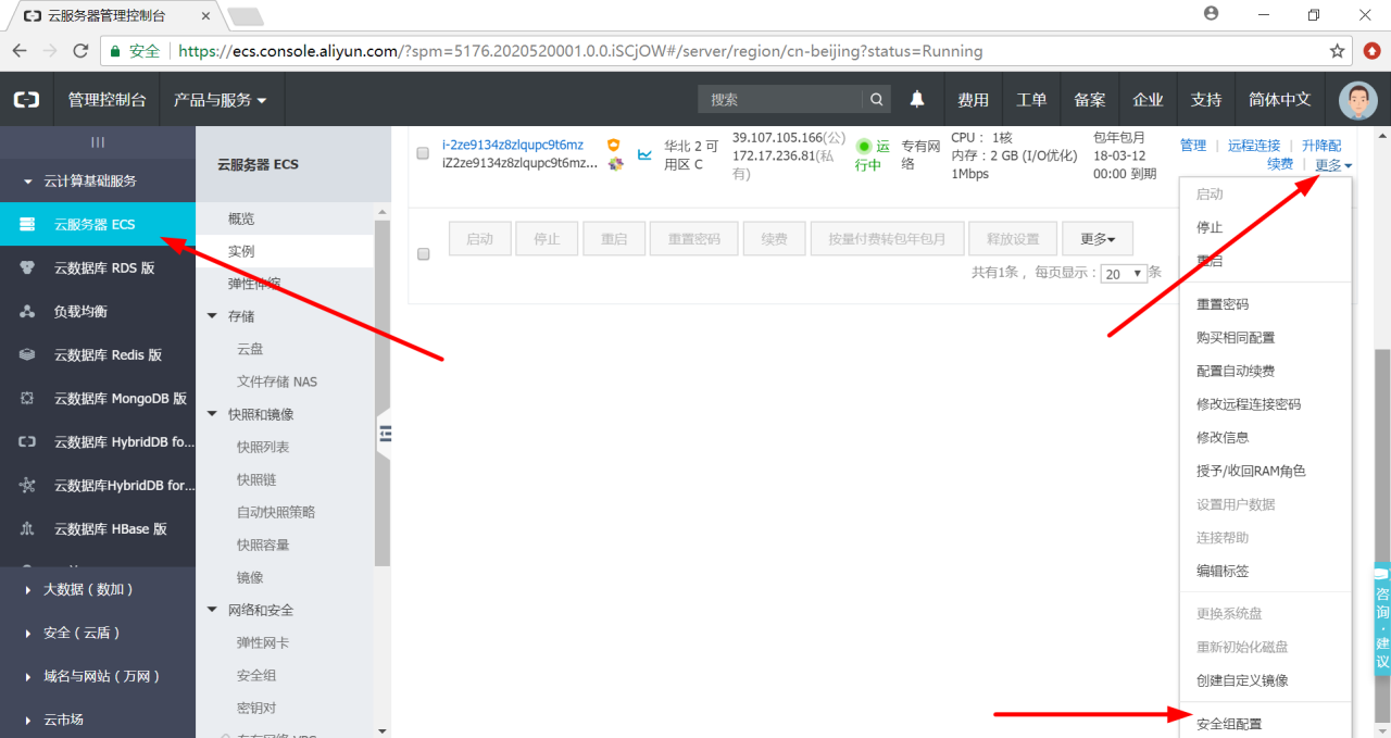 第三步:在弹出如下界面中点击“更多”,选择低端的“安全组配置”