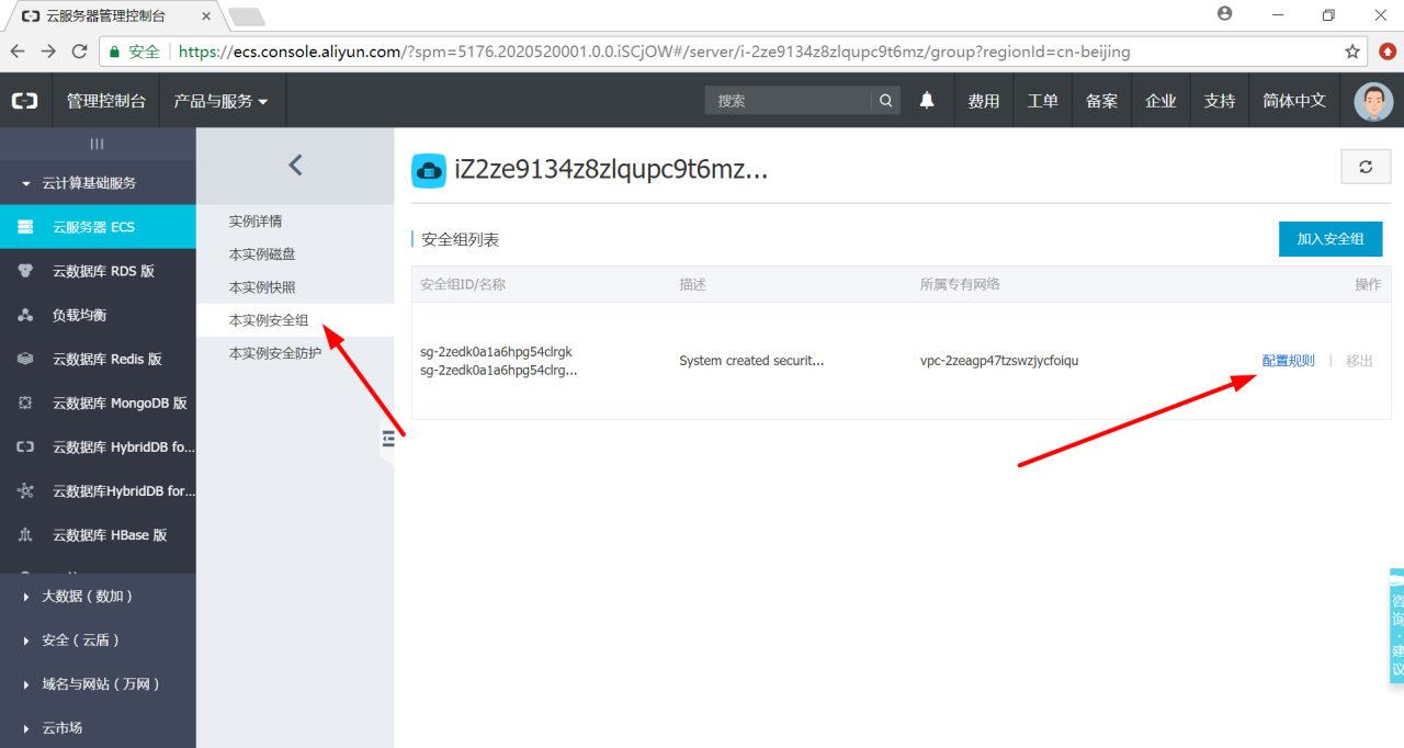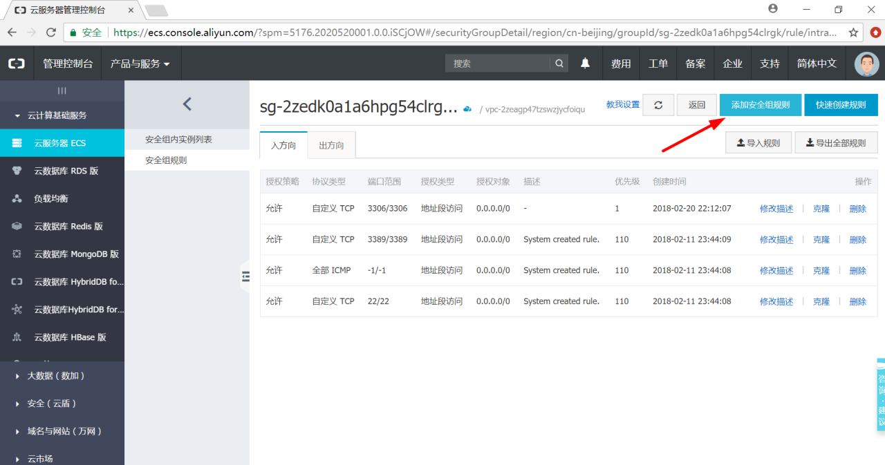 如果您还是无法访问如下图所示,则需要设置阿里云的安全组规则,而网上更多的资料忽略了该步骤。下面进行简单叙述: