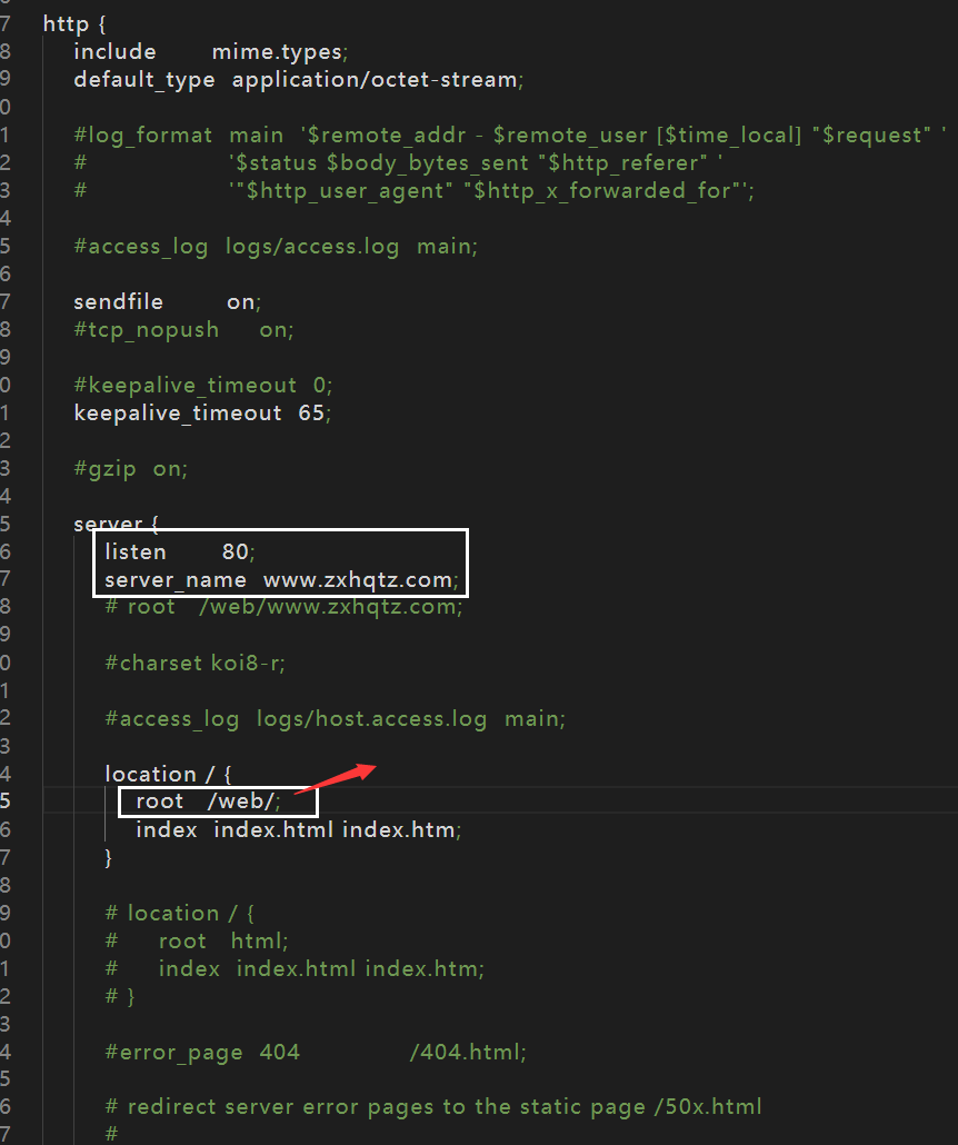 第一处是我们的监听端口,一般默认是80端口,然后就是server_name,这个是访问的服务器地址呢,可以用IP和域名等;