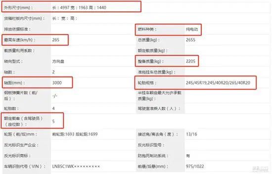 根据工信部申报消息,小米SU7的车身尺寸为4997/1963/1455(双电机版为1440)mm,轴距为3000mm。整备质量为1980kg(单电机版)或2205kg(双电机版)。轮胎规格为245/45 R19、245/40 R20、265/40 R20。