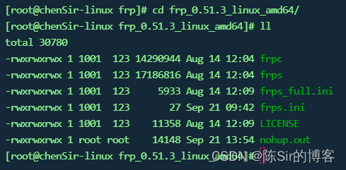 查看当前目录下的文件,其中作为服务端,我们只需要关注 frps 和 frps.ini 文件。我这里已经把frpc 和 frpc.ini 文件删了。