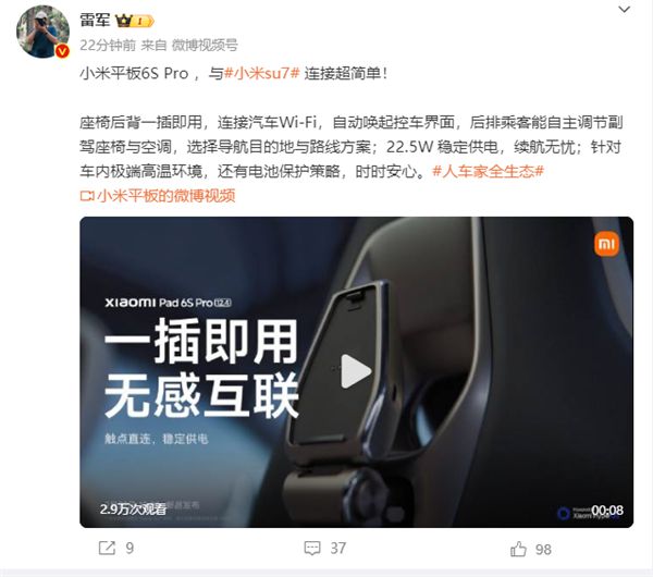 对此他还配上一段视频,来展示平板与汽车相连的便捷。使用小米平板6S Pro,放置在小米SU7座椅后背上,可实现一插即用、无感互联。放置好平板,就可自动连接上小米汽车的Wi-Fi,这时平板页面会自动显示为控车界面。