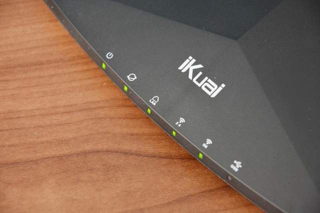 这款IK-Q1800企业级全千兆无线路由外观设计还是比较潮流,正面采用类似机甲造型的工业风格,有点像工业机器人的“正脸”。iKuai LOGO和指示灯居中设计,两条拉伸孔将面积一分为三。