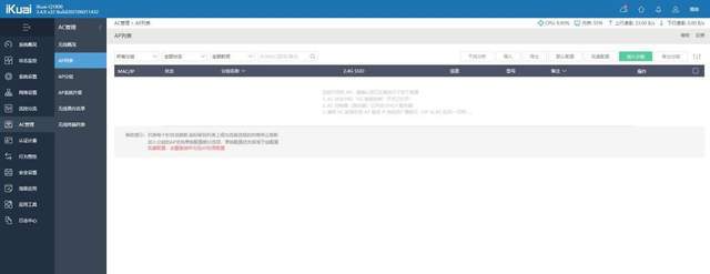 这款IK-Q1800路由系统中还集成了AC智能控制功能,企业可以通过AC智能控制模块对路由系统所连接的AP(Access Point,无线访问节点)进行统一管理,包括为AP提供启动的默认配置、对AP进行批量配置修改、查看AP信息和重启、升级等维护操作。很方便企业这种大型内部网络集中管理,无线WiFi配置一次搞定。