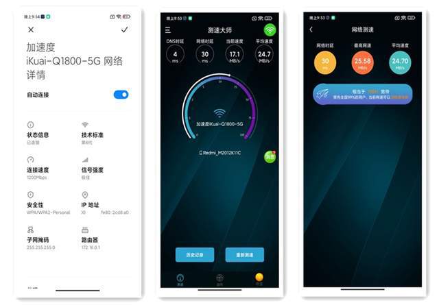 经测试这款IK-Q1800路由器WIFI连接速度达到了1200Mbps,100M的正常宽带也能跑出几乎“满血”的水平,确实比较优秀。