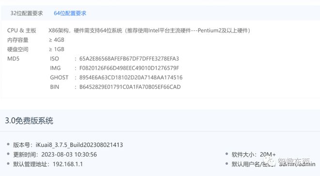 当你安装好这台软路由用电脑后,我们还需要在另一台电脑(或者这台电脑临时安装一个系统,乃至使用WinPE)制做安装U盘。首先,浏览爱快官方网站下载页面(下载地址:https://www.ikuai8.com/component/download),下载ISO版本(注:虚拟机用户也下载ISO版本),强烈推荐下载64位版本,容量只有不到50MB。