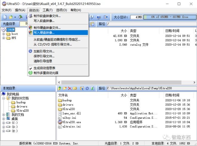 这时将U盘插入电脑,然后启动UltraISO,点击“文件—打开”加载刚刚下载的爱快安装镜像,点击UltraISO上方的“启动—写入硬盘映像”,并选择U盘(注意不要选错)点击写入开始制作。