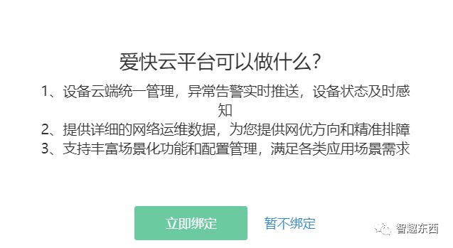 登录后,爱快会提示是否绑定,这个绑定功能可以让路由器实现远程的管理,非常方便,不过我们现在还无法实现,点击“暂不绑定”继续基础设置。