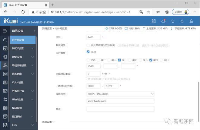 拨号成功后,下拉滚动条,建议设置“定时重拨”,一般2-3天重拨一次为宜,勾选“开启”然后设置重拨日期,并设置时间,爱快支持最多三个不同的时间点重拨,推荐只设置一个即可。