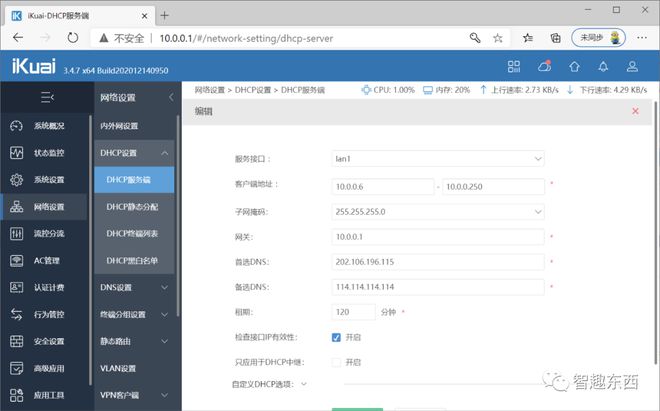 正常上网后,我们设置一下内网的DHCP,这样以后就不需要电脑使用手动输入的IP地址,也方便其他设备接入。点击“网络设置”中的“DHCP服务端”,点击“添加”,然后客户端IP地址,注意不要从10.0.0.1开始计算!子网填写255.255.255.0,网关填写软路由地址即10.0.0.1,DNS请查询当地电信运营商提供的地址。