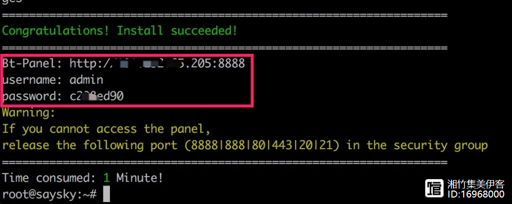 这里会显示宝塔后台地址和账号密码,可以手动复制到记事本暂时存起来。