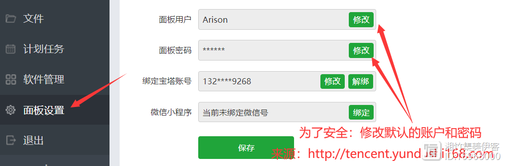 为了安全考虑,在云服务器上安装完成宝塔面板之后,你应该马上修改你的宝塔面板登录账户和密码(注意:这个账户和密码不是宝塔面板官网的,而是每个云服务器访问宝塔面板需要用到的账户和密码)