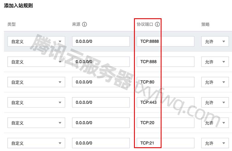 - 类型选项中腾讯云预置了3389、22、Ping、80、443、3306、1433等规则,8888端口没有,腾讯云服务器网选择自定义;