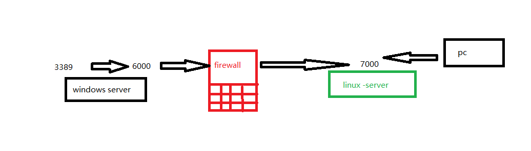 本次的试验目的是在另一台pc上连接内网服务器的3389端口,在环境搭建阶段我们已经将防火墙打开,而且由于pc和内网服务器不在同一网段,所以是无法直接连3389的,因此,我们需要将内网服务器的3389转发出来,转发到公网服务器的一个端口上,这样我们通过连接公网服务器的某个端口,就可以访问内网服务器的3389了。整个流程如下。(没啥专业的画图软件只能用windwos自带的画图了,原谅我的灵魂画术)
