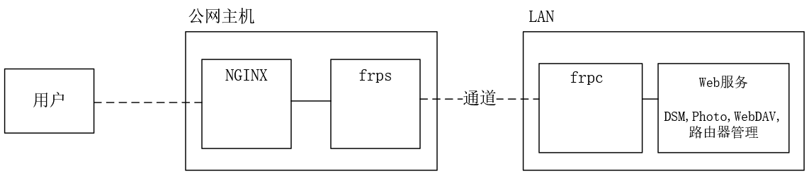用户通过访问服务端的 frps,由 frp 负责根据请求的端口或其他信息将请求路由到对应的内网机器,从而实现通信