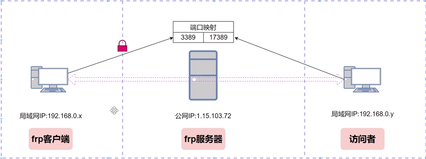 在被访问端安装frp客户端,安装一个frp服务器,被访问端提供信息注册到frp服务器上,访问者只需要访问公网frp服务器以及暴露的端口