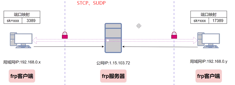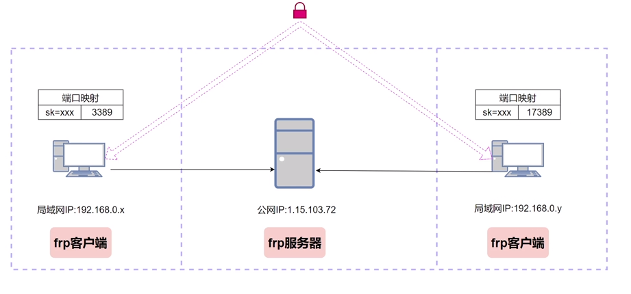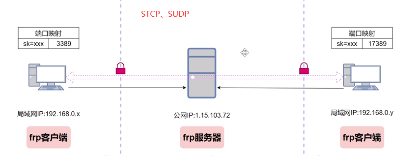 第二种:需要2边都安装客户端来保证安全,不需要在公网上暴露端口,传输都是加密形式,但是要经过frp服务器,会被frp带宽影响,数据传输瓶颈