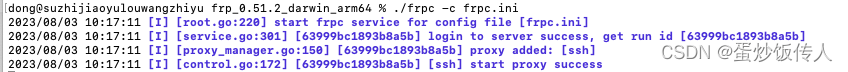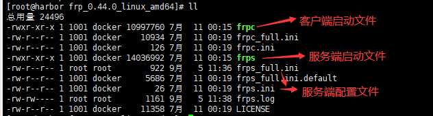 # 服务端frps.ini配置 [root@harbor frp_0.44.0_linux_amd64]# cat frps.ini [common] bind_addr = 0.0.0.0 bind_port = 7000 kcp_bind_port = 7000 bind_udp_port = 7001 max_pool_count = 5 tcp_mux = true heartbeat_timeout = 90 authentication_timeout = 900 dashboard_addr = 0.0.0.0 dashboard_port = 7500 dashboard_user = admin dashboard_pwd = admin dashboard_tls_mode = false log_file = ./frps.log log_level = debug log_max_days = 3 tls_only = true authentication_method = token token = 12345678 # 秘钥自己设置 # 启动程序 ./frps -c ./frps.ini 查看日志: [I] [root.go:218] frps started successfully