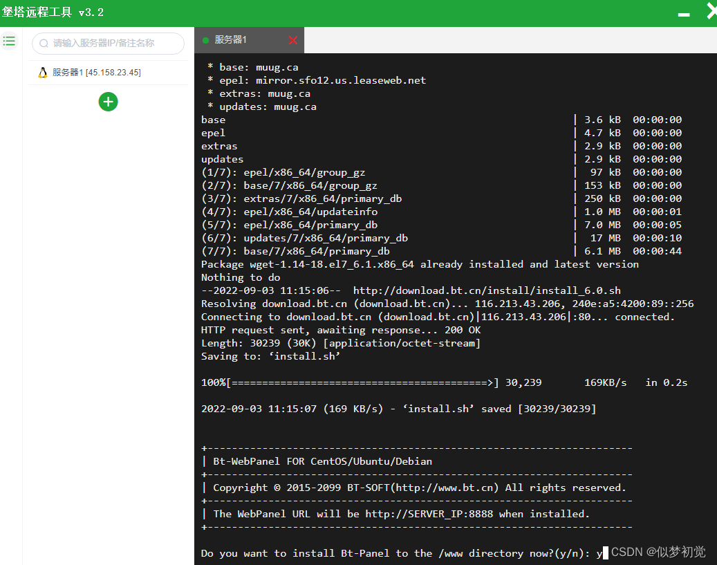 3、执行宝塔安装命令,直接将命令复制到堡塔SSH终端后粘贴,然后回车即可