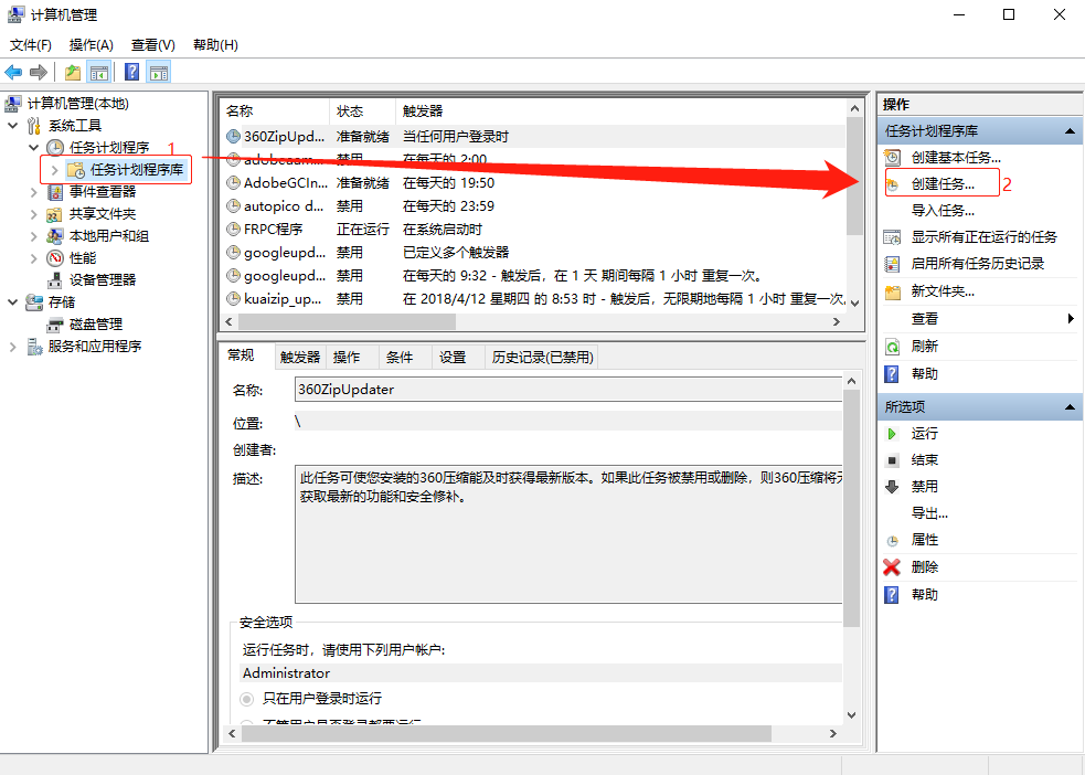 2.右击我的电脑>管理>系统工具>任务计划程序>任务计划程序库>创建任务
