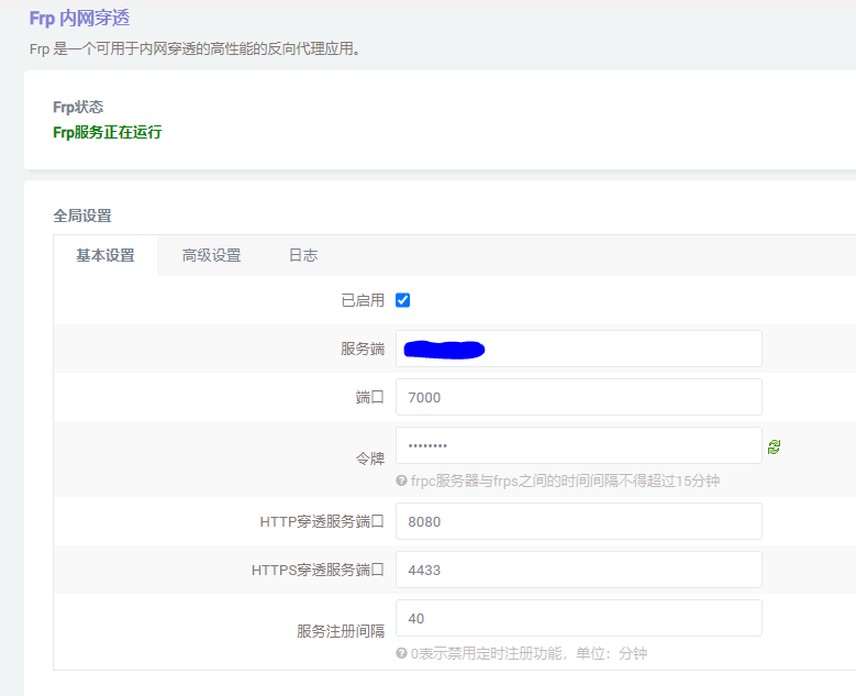 2. frp的客户端frpc设置,我的是在openwrt设置(服务端的ip,端口,授权码)。