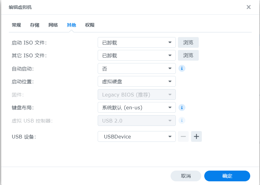 但是DSM的VMM套件贴心的提供了USB设备映射的功能,这一映射是直通的,因此可以不受DSM的限制。需要映射的USB设备可以使用VMM映射到虚拟机内使用。
