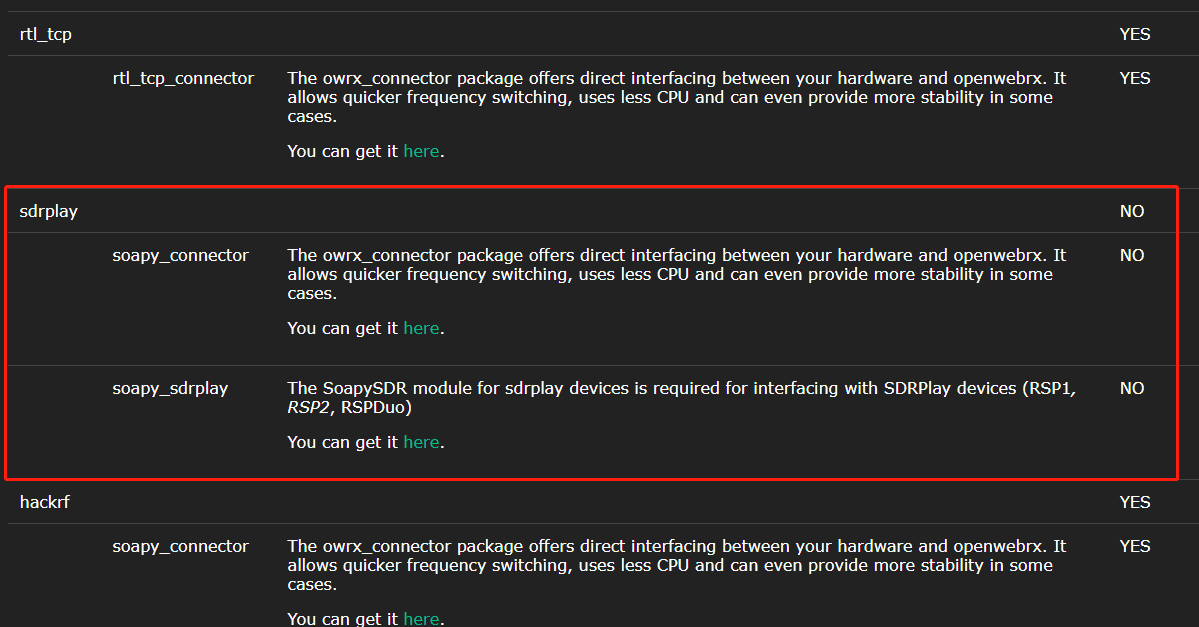 访问你刚刚搭建好的SDR的后台,找到Feature report页面,发现SDRPlay的支持后面状态是NO