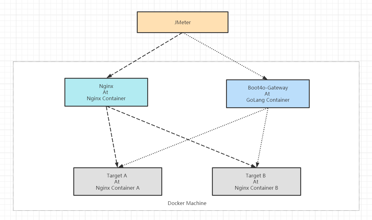 测试用例分别各使用Nginx的反向代理功能和Boot4go-gateway来对WEB API目标节点(单个节点)进行反向代理,代理的WEB API目标节点都是使用Nginx部署的Http服务。通过对Nginx的反向代理提供的URL和Boot4go-gateway提供的反向代理的URL进行高并发的压力测试, 这样对于这场PK,目标的WEB API是一致的,网络环境是一致的,差异仅仅就在于提供反向代理的产品上面, 这样经过各种不同压力场景下得到的PK的结果,也可以反映出这两种不同的反向代理产品的性能差异了。