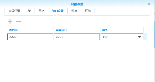 高级设置->端口设置,配置好ssh的端口,容器内得ssh端口不能用22,会和nas的冲突,如果装其他程序需要端口可以提前设置。