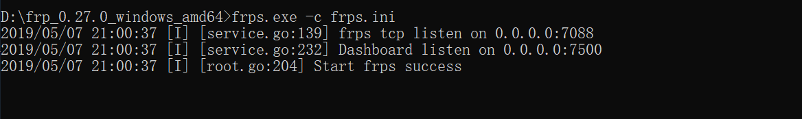 2.按下windows+R输入cmd进入命令窗口,进入到安装目录下运行frps.exe -c frps.ini.