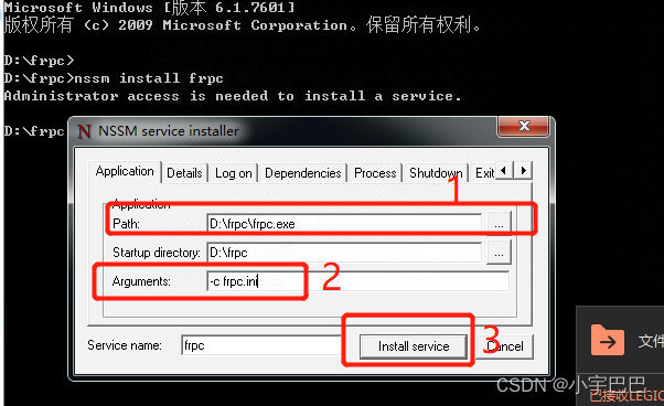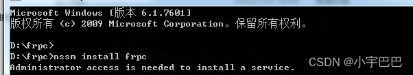 - 使用nssm将frpc注册成windows服务实现frpc随着windows开机启动而启动,以管理员权限运行cmd,执行下面命令。