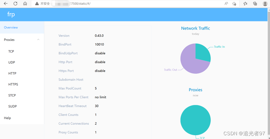查看frp网页端管理界面http:{ip}:7500/static/ ,输入之前配置的dashboard配置的用户名和密码。