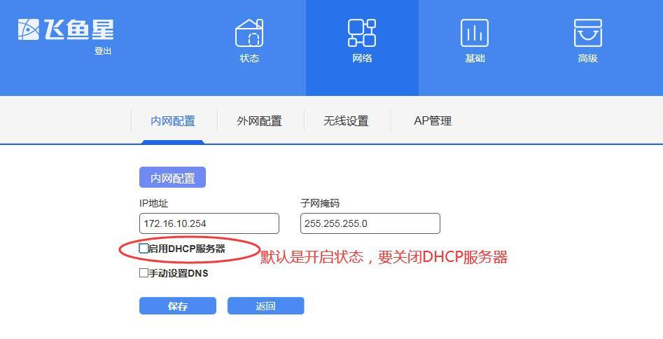 7、关闭AC50W的DHCP服务器。终端自动获取IP地址通过主路由器来下发。