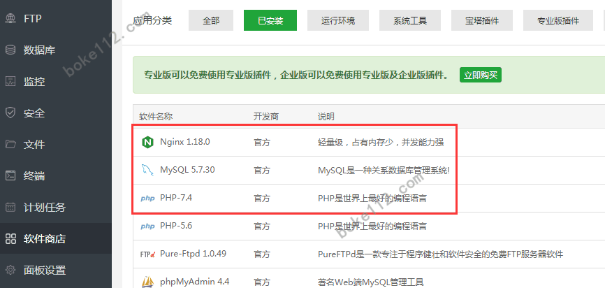 1、因为本文所说的方法仅仅是将博客网站的文件、数据库可数据等迁移到新服务器,并不包括运行环境,所以为了保证搬家后网站能够正常访问,建议新旧服务器上的环境保持一致,建议先进入到旧服务器上的宝塔面板 >> 软件商店 >> 应用分类中点击“已安装”,即可看到旧服务器上的运行环境,如下图就是 nginx 1.18.0、MySQL 5.7.30、PHP 7.4 等 >> 在新服务器宝塔面板上安装同样的运行环境。