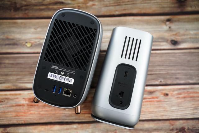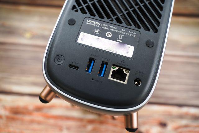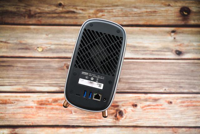 考虑到 N5105 10W 的 TDP,以及2块3.5英寸硬盘+2块 SSD 的散热,绿联私有云 DH2600 在机身背面放置了一个大尺寸静音风扇。下半部则分别为电源键,USB-C*1、USB-A(3.0)*2、RESET 孔,2.5G 网线接口以及 DC 电源接口。