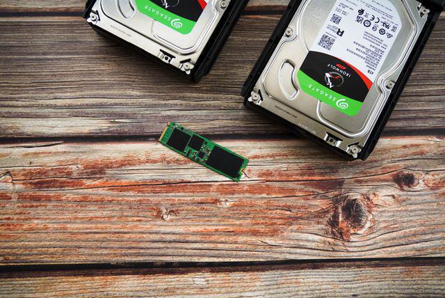 硬盘支架部分依旧采用了免工具安装设计,按住底面按钮向侧面拉开,放入硬盘即可完成安装。这里我选择了 NAS 专用的希捷酷狼硬盘,同时使用了一根家中笔记本退役的三星 256GB SSD,未来如果需要升级可以替换两根大容量 SSD 作为存储盘。