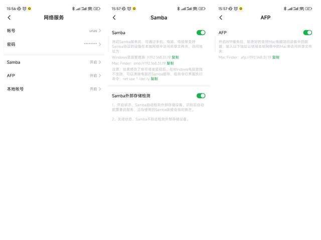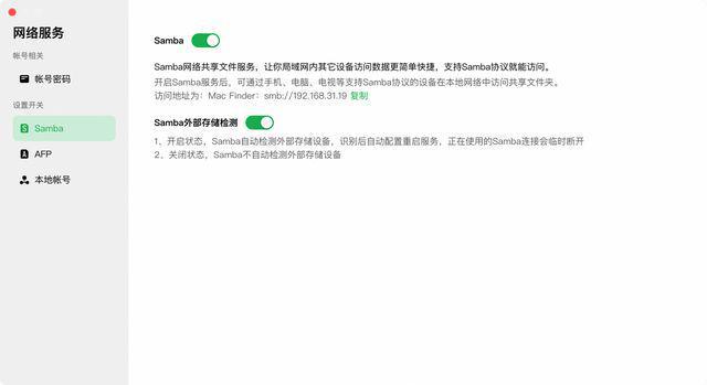 作为存储服务器,内网访问功能也是非常高频的场景,家庭影音服务器的搭建也依赖于 SMB/NFS/DLNA 等协议。目前绿联云支持 SMB、AFP 以及 DLNA 三种协议,开启的方式也非常简单,在手机 APP 或是 PC/Mac 客户端-网络服务-SMB/AFP/DLNA 内设置账号密码,然后打开对应服务即可。