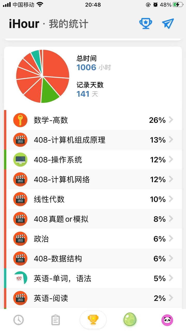 复习总时长(有记录部分,7月份开始):1006小时,其中408部分花费500+小时,7月份之前大概做了这些事:把408课本和王道看了看,数学看了看课本,英语背了些许单词,时间很零碎,7月份觉得在家效率不行,再这样下去要完蛋,于是跑到武汉在学校旁边租了个房子,直接回学校旁边租了个房子,期间去过付费自习室,整体还是从9月份开学后,去学校图书馆和自习室后效率慢慢提高。