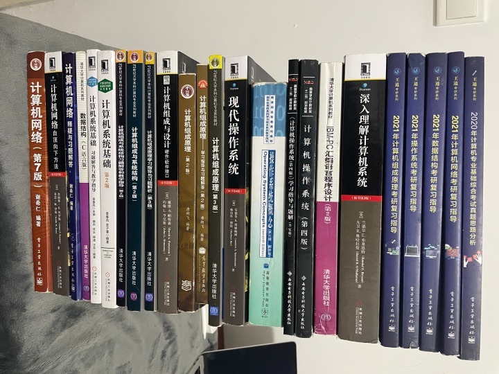408计算机专业基础综合因为个人粗略看过408的卷子之后,感觉408也是分大小年的,奇难偶易(相对难度),所以21年的我预判408会出得很难,所以在408上花了狠功夫,虽然今年相对以往难度有所下降。整个复习过程中,我的408复习时间甚至超过数学,因为我认为对于一个计算机专业的学生或者想进入计算机领域的学生来说,408四门课是基础中的基础,我本科并没有将这几门课学的多好,所以我想通过考研来弥补一下自己的专业基础,其次,如果没考上,408学好了对春招也是大有帮助的,所以我整体的信念是408值得我多投入一点。我考研过程搜了很多帖子,包括20年浙大计算机408单科状元恒少139分的帖子以及其他高分选手的帖子,综合一番后,我得出的结论是,408偏应试,良好的做题思维比如反代法可以解决不少问题,应该尽量简化问题。核心使用王道单科书+真题,课本在第一轮的时候我会详细看,毕竟感觉王道上说的还是不够仔细。对于黑书,我的态度是,感觉课本和王道都没说清楚,也找不到人问,可以挑相应的章节看看。黑书里只有自顶向下我是全部都看了的,相比谢希仁,我觉得这本书让我建立起了一个整体的概念,也很友好(当然部分章节超纲了还是得跳),做了一两个tcp,udp服务器的实验,感觉真的挺不错,不过迫于时间紧张,后面就没涉及书中代码了。当然,我现在回过头来看,王道或者谢希仁多过两遍,即使我看过黑书,也觉得不是很必须看黑书。用过的书,除了王道,其他基本用来当字典,想看的时候查一查: