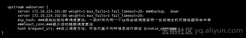 server 172.18.224.101###可选参数有weight服务器的权重,max_fails=3定义最大失败尝试次数,backup定义该主机为备用主机,down手动使该主机下线