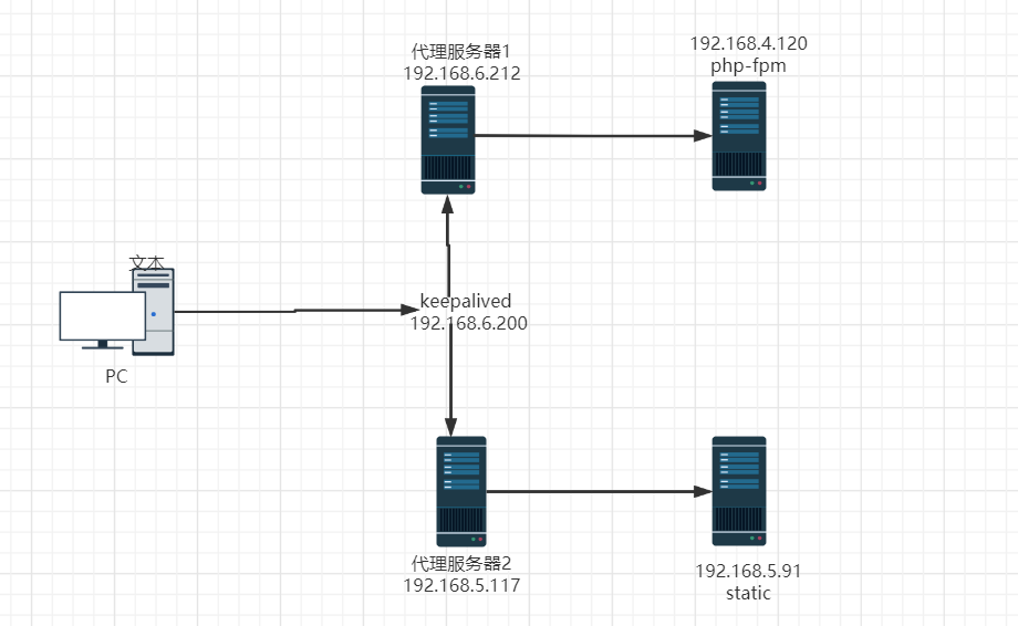 使用keepalived监控集群系统中各个服务节点的状态,某节点出现问题可以将服务自动切换到其他节点,从而保证服务的高可用,使用nginx反代后端php-fpm服务器和静态资源服务器,使不同的请求分发到后台不通服务器上,以起到减轻单个服务器压力的作用。