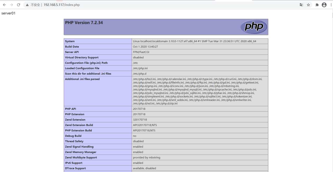 [root@localhost ~]# cat /www/index.php <?php echo "server01"; phpinfo() ?>